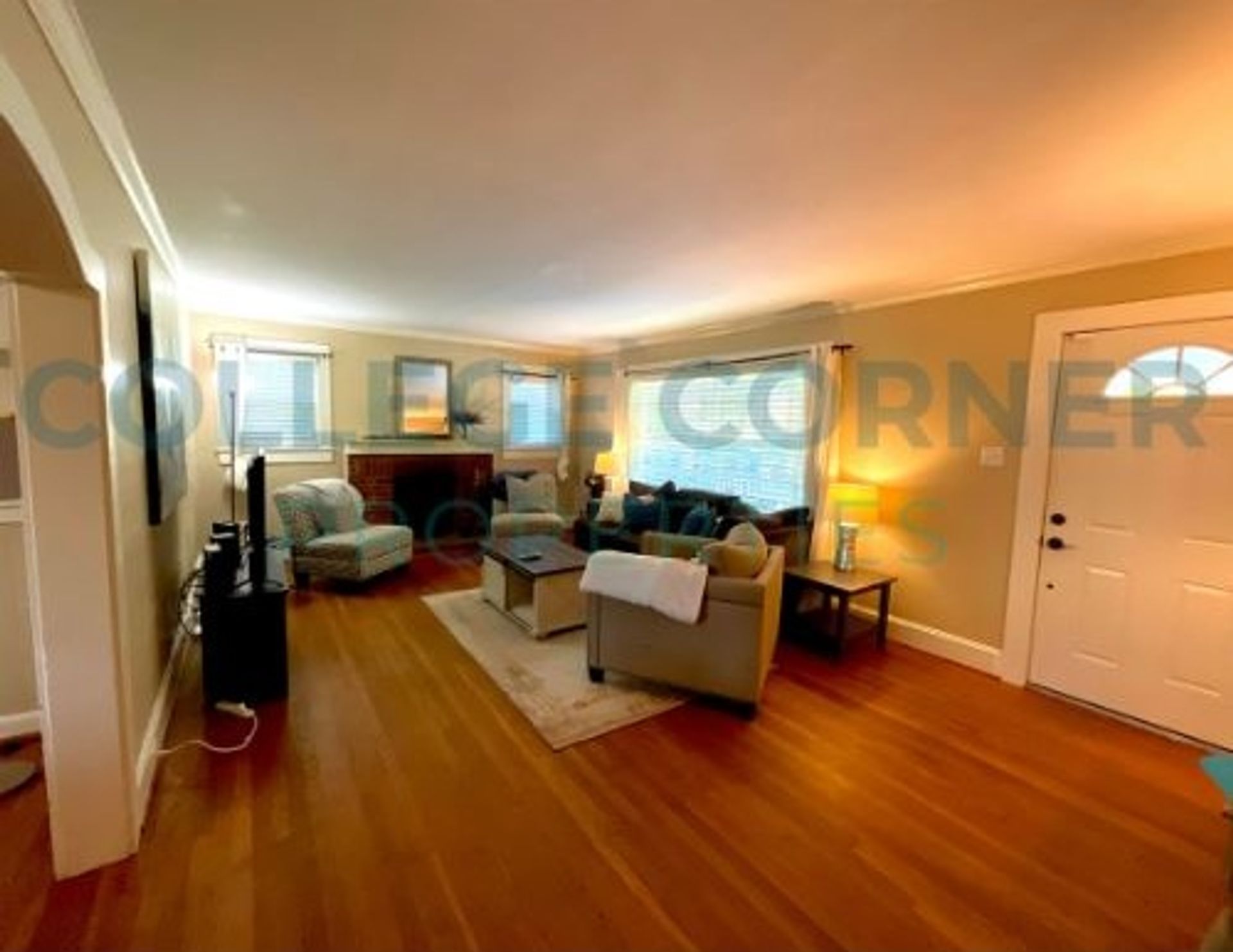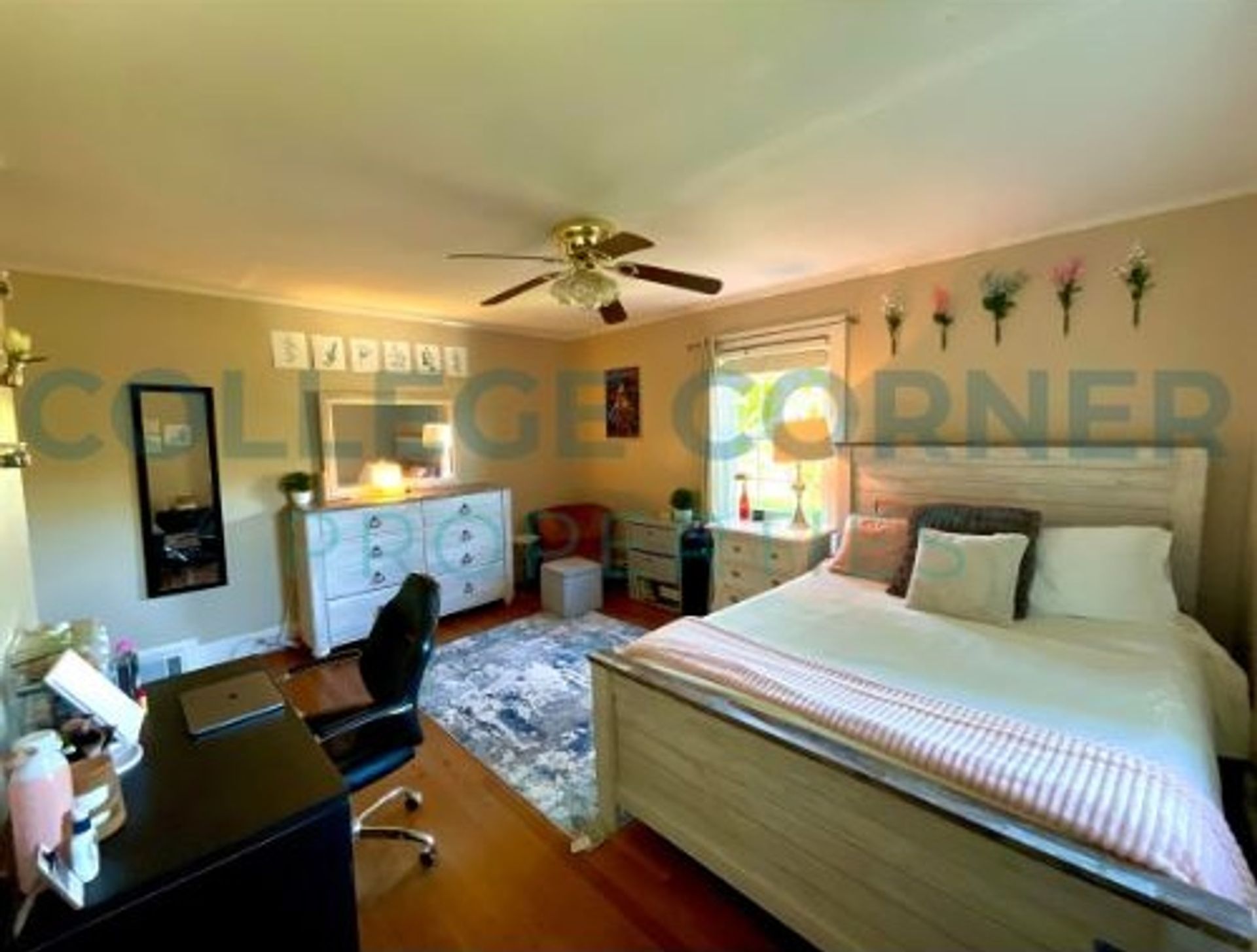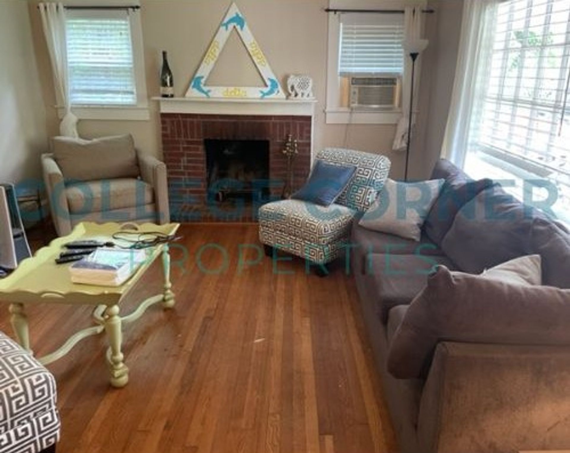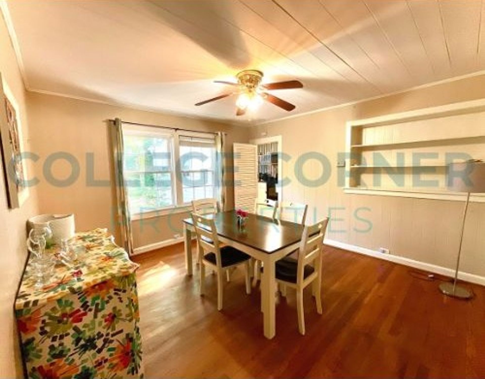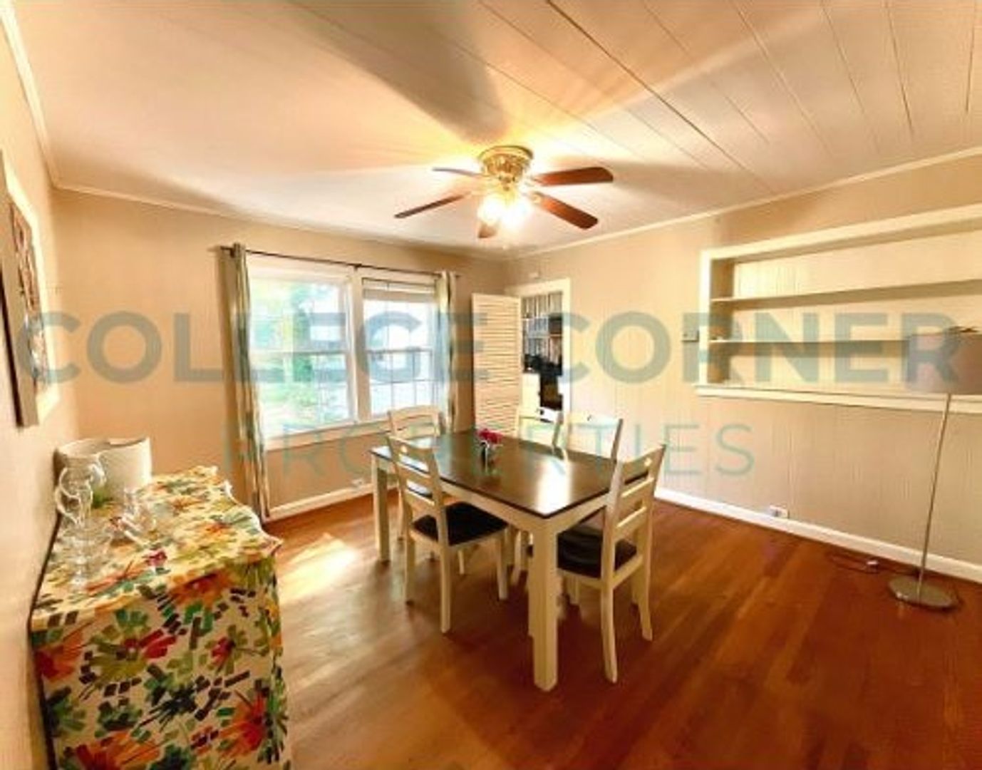 There is a dedicated laundry room off the enclosed back porch, which provides access to the backyard and also includes a study counter. One bathroom is attached to a bedroom, while the other bathroom is a hallway bathroom shared between two bedrooms. The home comes fully furnished with a TV, sofa, chairs, and a dining table.