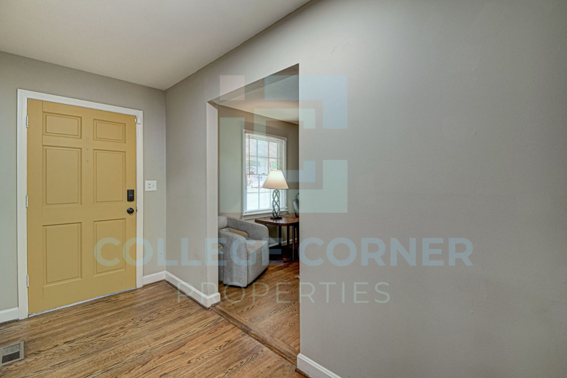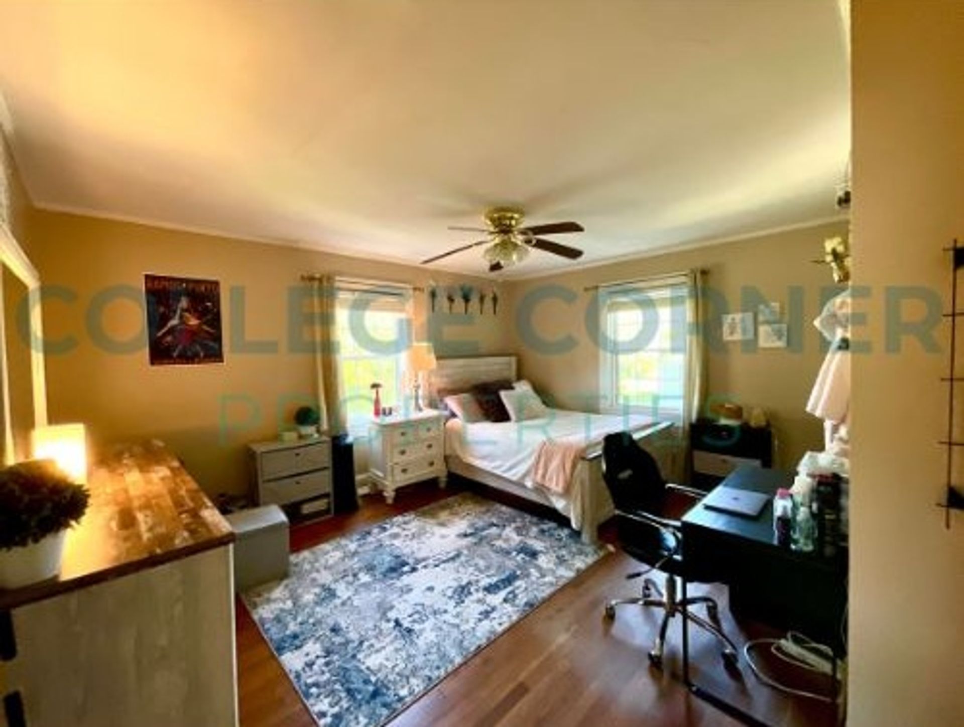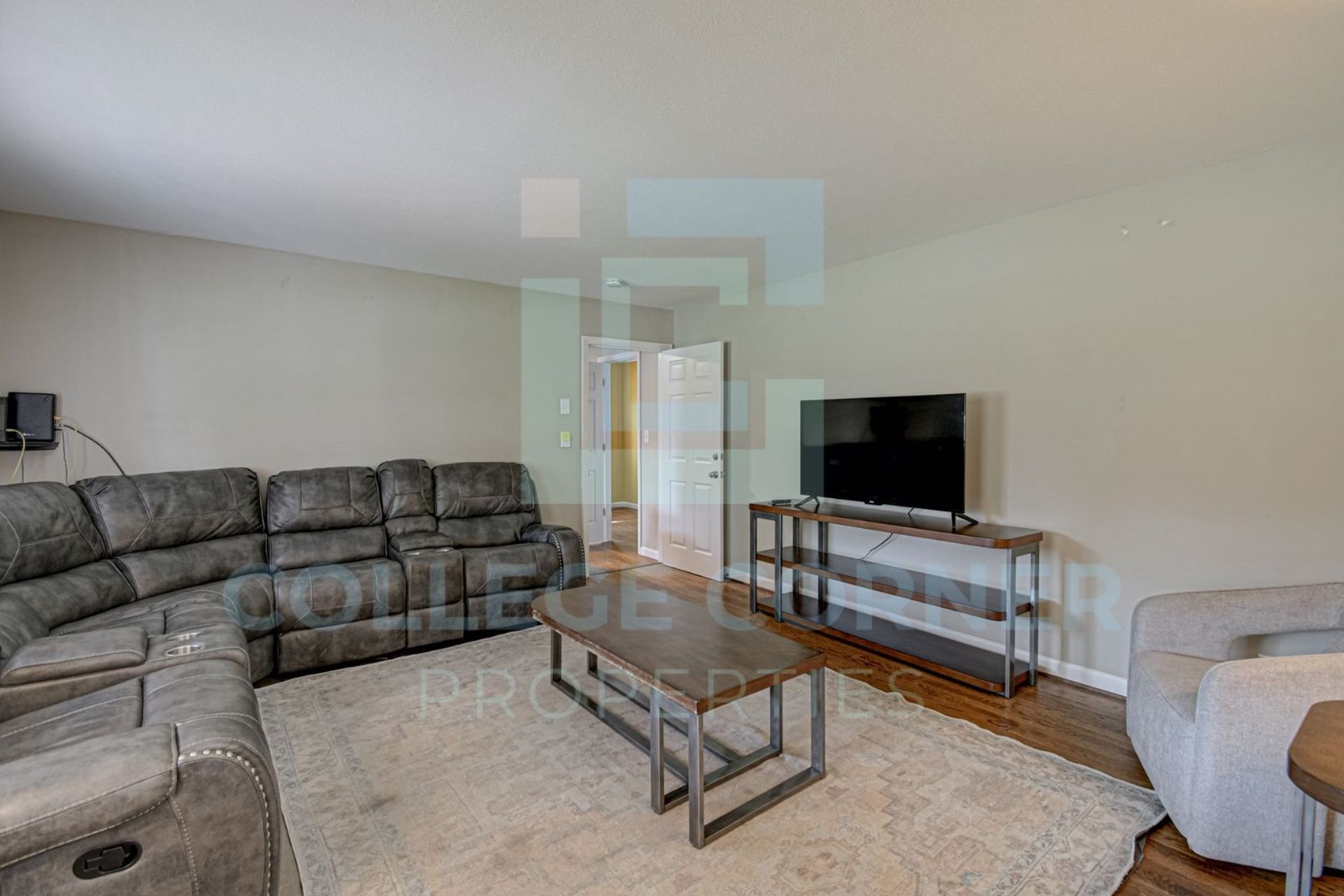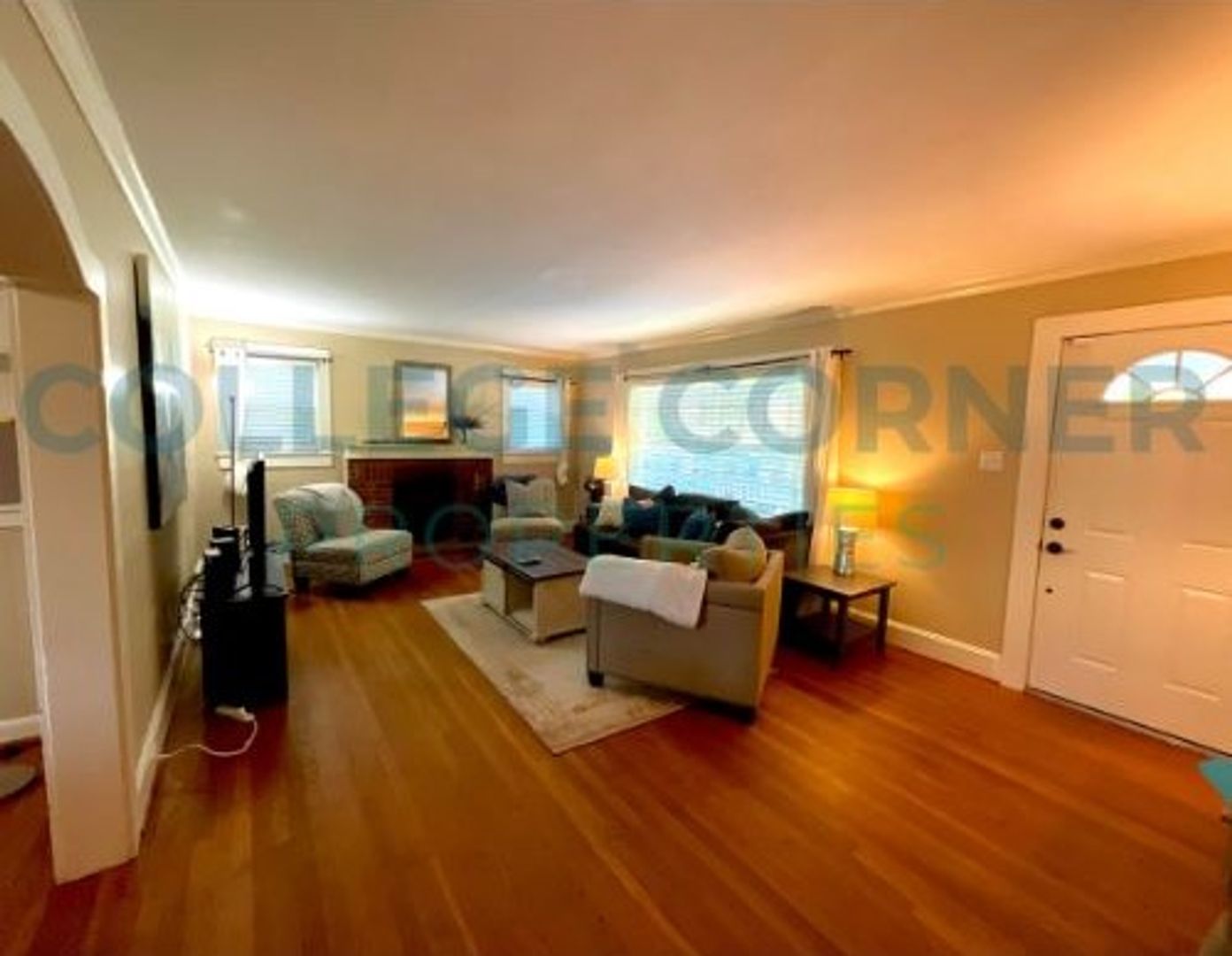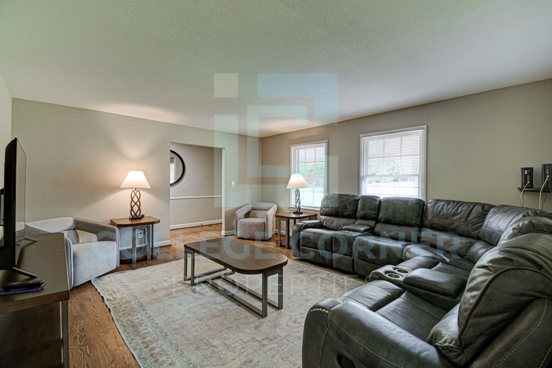There is a dedicated laundry room off the enclosed back porch, which provides access to the backyard and also includes a study counter. One bathroom is attached to a bedroom, while the other bathroom is a hallway bathroom shared between two bedrooms. The home comes fully furnished with a TV, sofa, chairs, and a dining table.