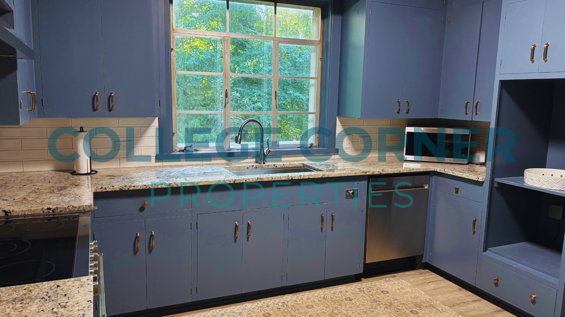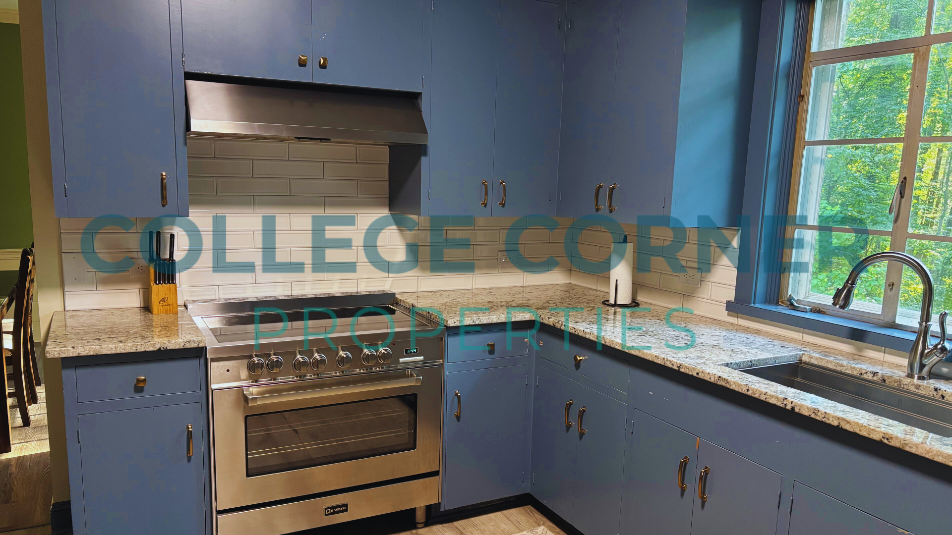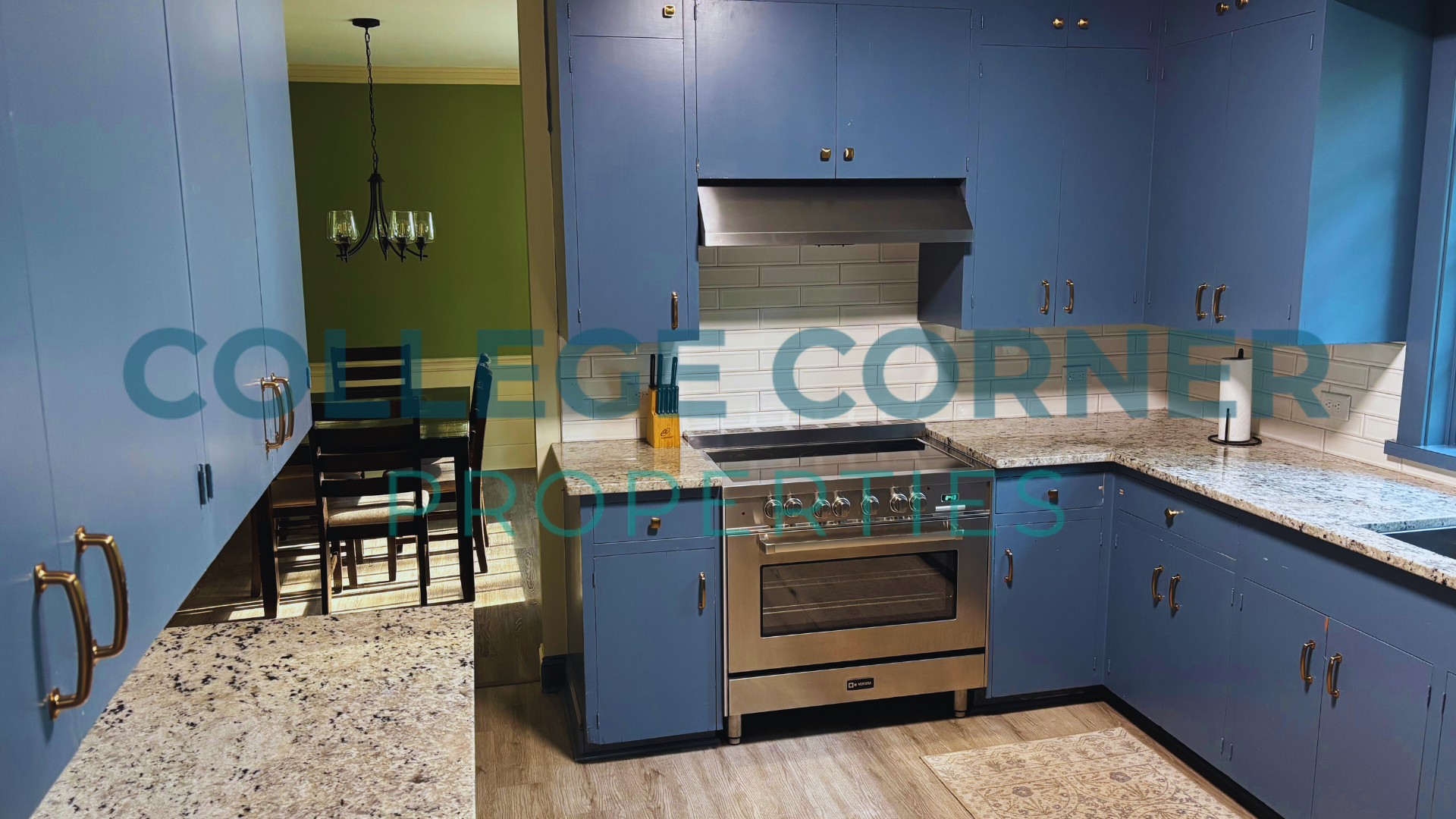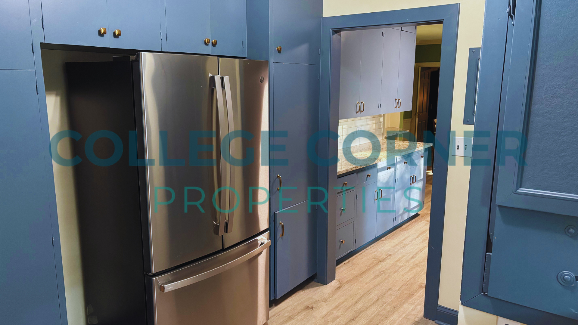 The main floor includes a primary bedroom and bathroom with a dressing area, as well as a formal living room and library that provides access to a screened-in porch. The dining room connects to the original kitchen, which is accompanied by a pantry and laundry area located near the side entrance. Modern appliances and granite countertops enhance the blue-painted cabinets in the kitchen.