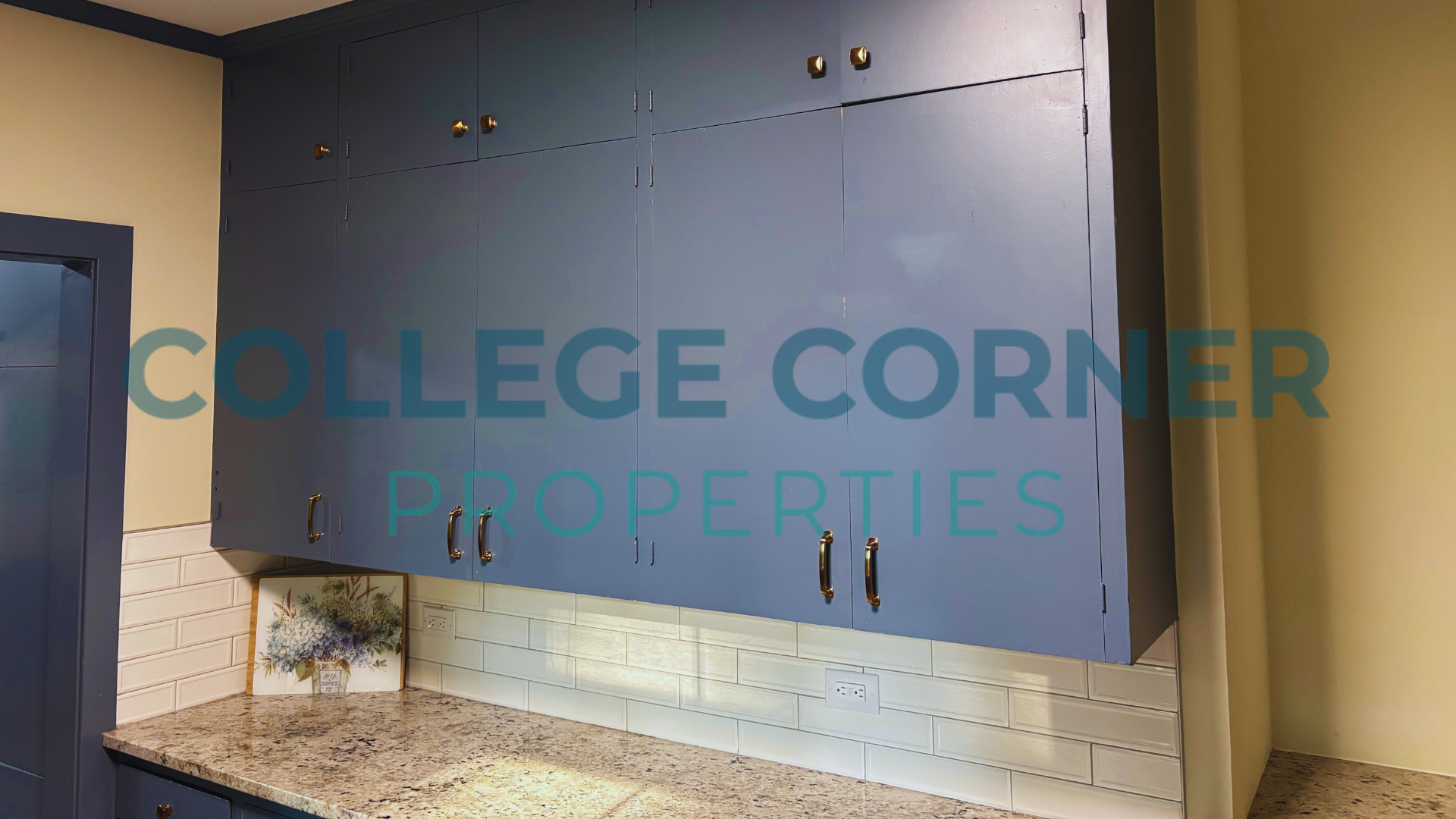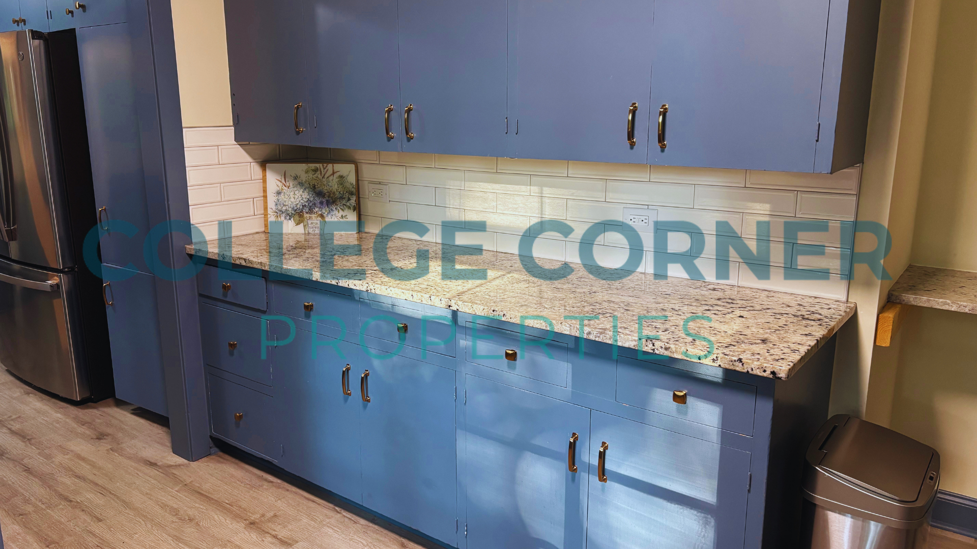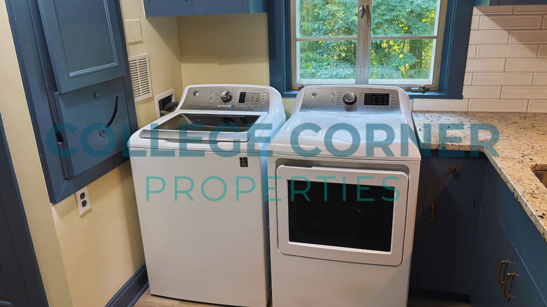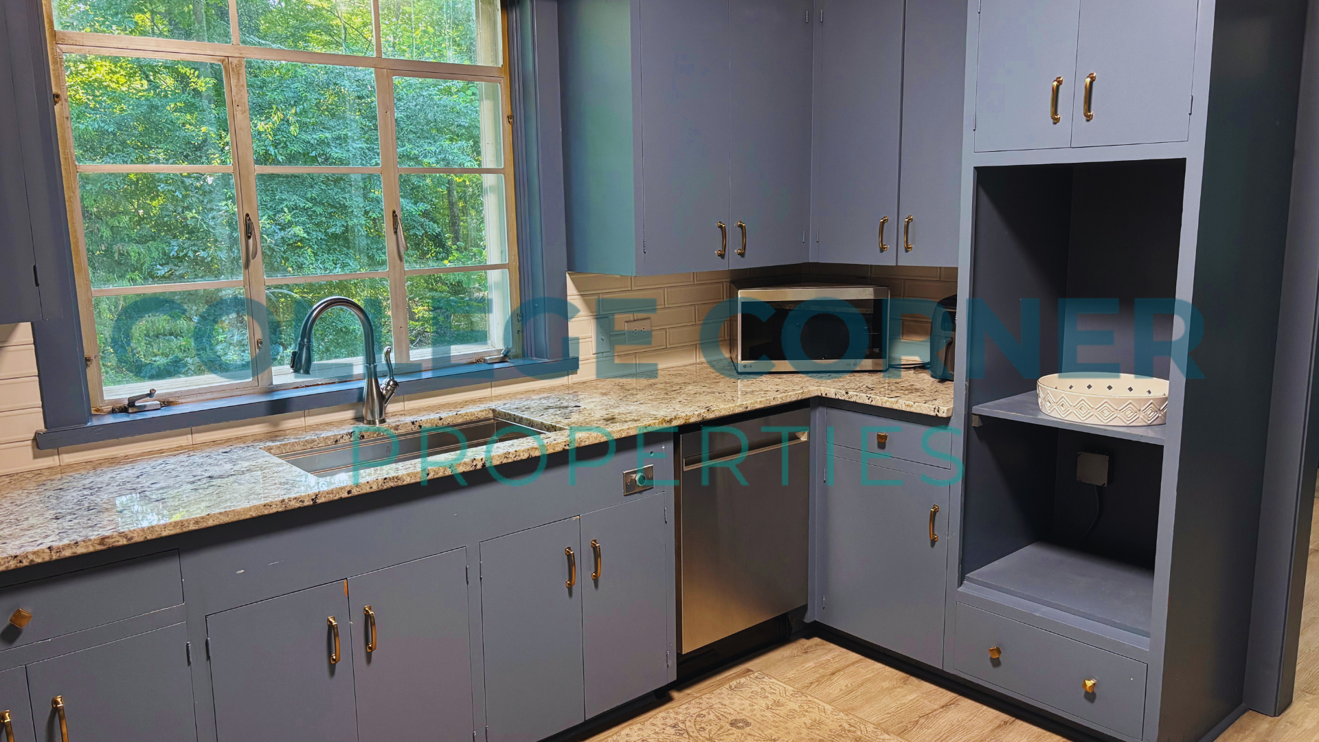 The main floor includes a primary bedroom and bathroom with a dressing area, as well as a formal living room and library that provides access to a screened-in porch. The dining room connects to the original kitchen, which is accompanied by a pantry and laundry area located near the side entrance. Modern appliances and granite countertops enhance the blue-painted cabinets in the kitchen.