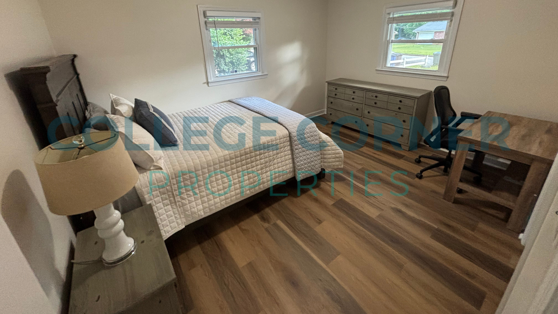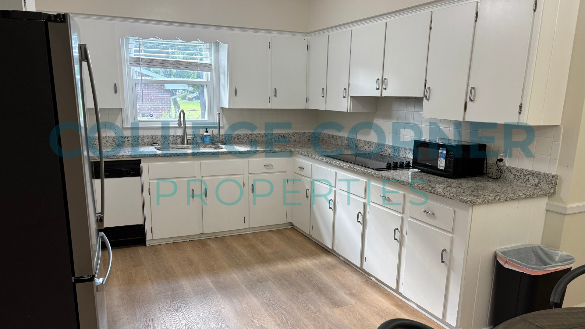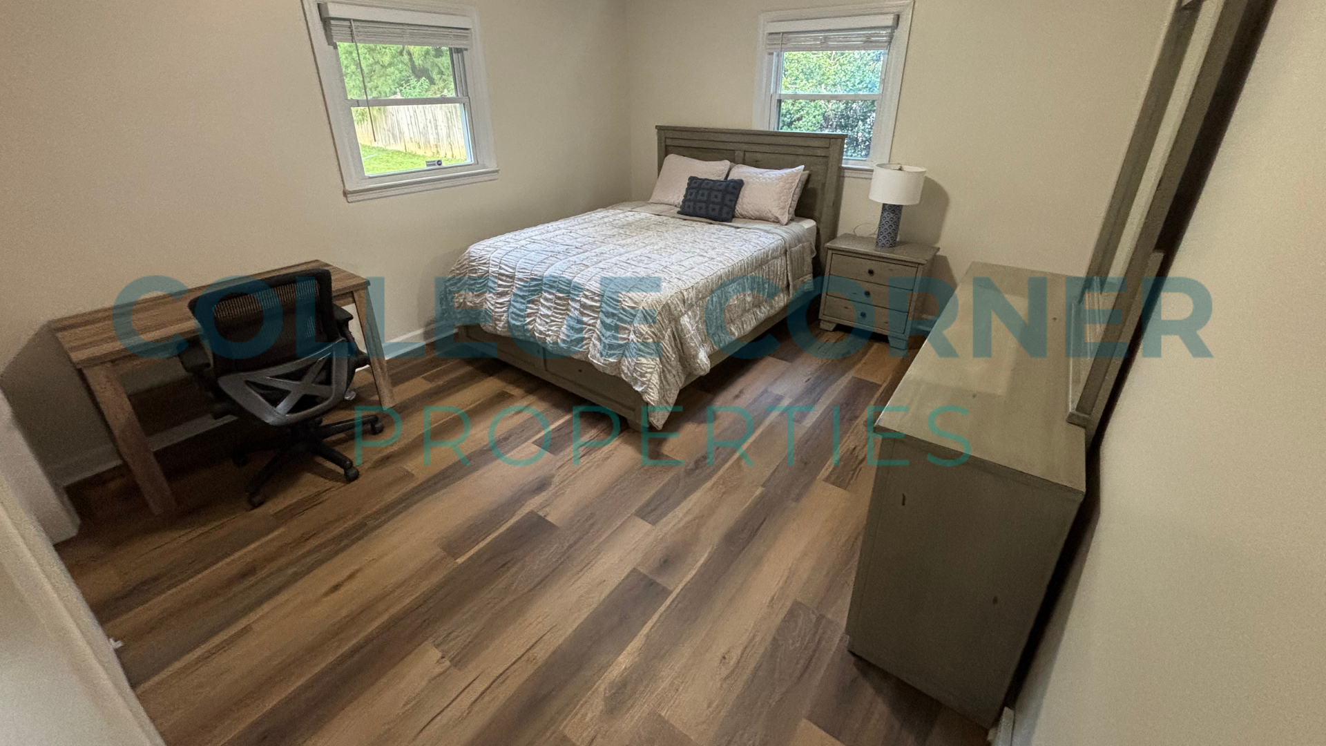 All four bedrooms have designer-inspired Queen-sized Beds and a Nightstand, Dresser, and Desk, setting the stage for you to bring your style. The home has no carpet; new LVP flooring and paint have been updated in 2024. The large kitchen has ample cabinets, granite counters, stainless appliances, and an eat-in kitchen. The open floorplan refers to the main living space, offering a sofa, roomy club chairs, TV cabinet, and additional furniture.