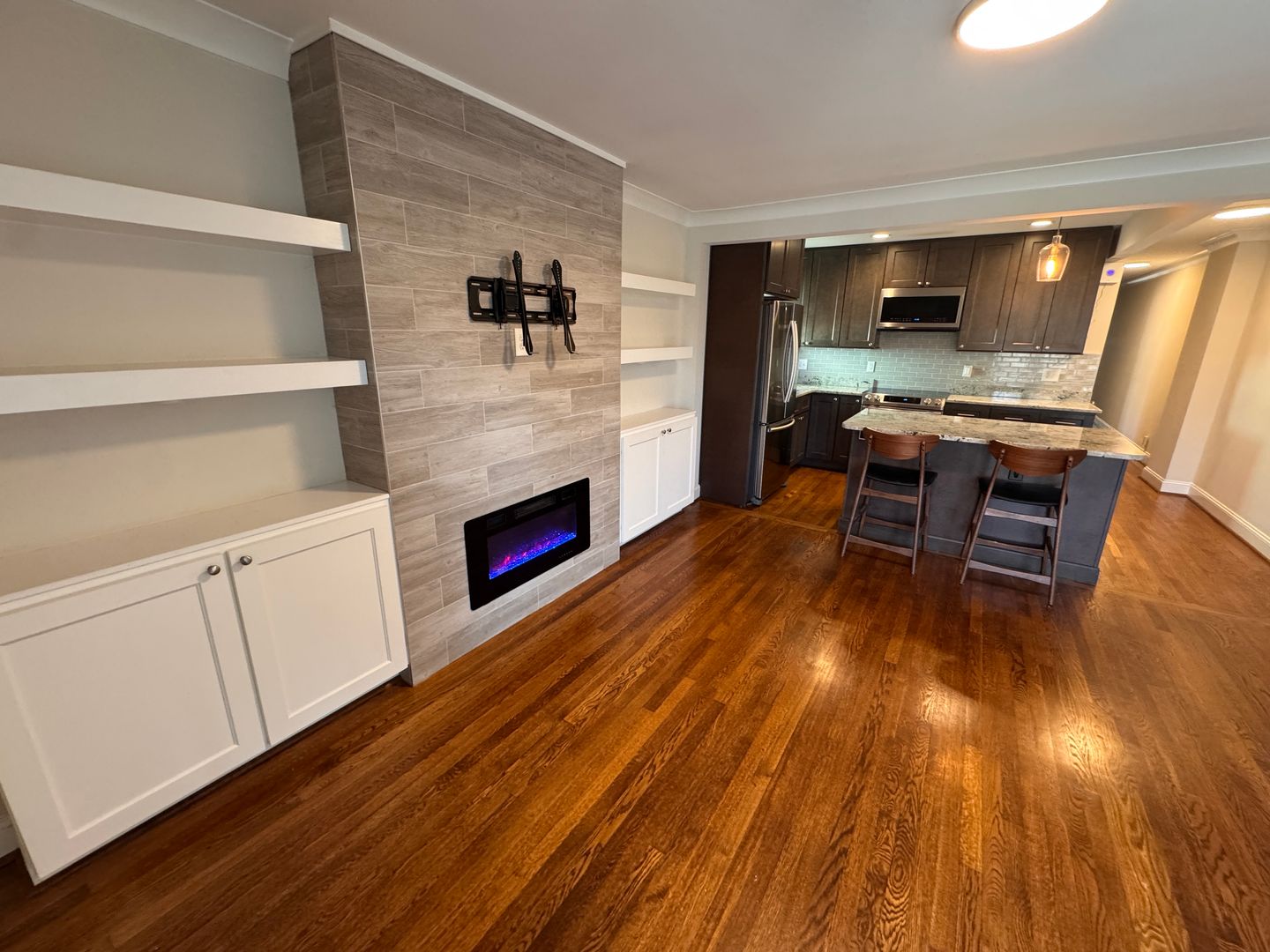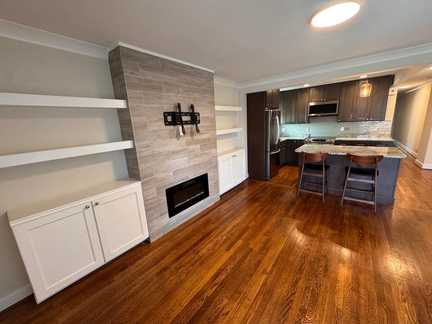 Enjoy additional built-in shelving and a modern fireplace feature wall that adds warmth and character to the space. Recessed lighting, updated fixtures, and neutral tones create a clean, contemporary feel throughout the home.