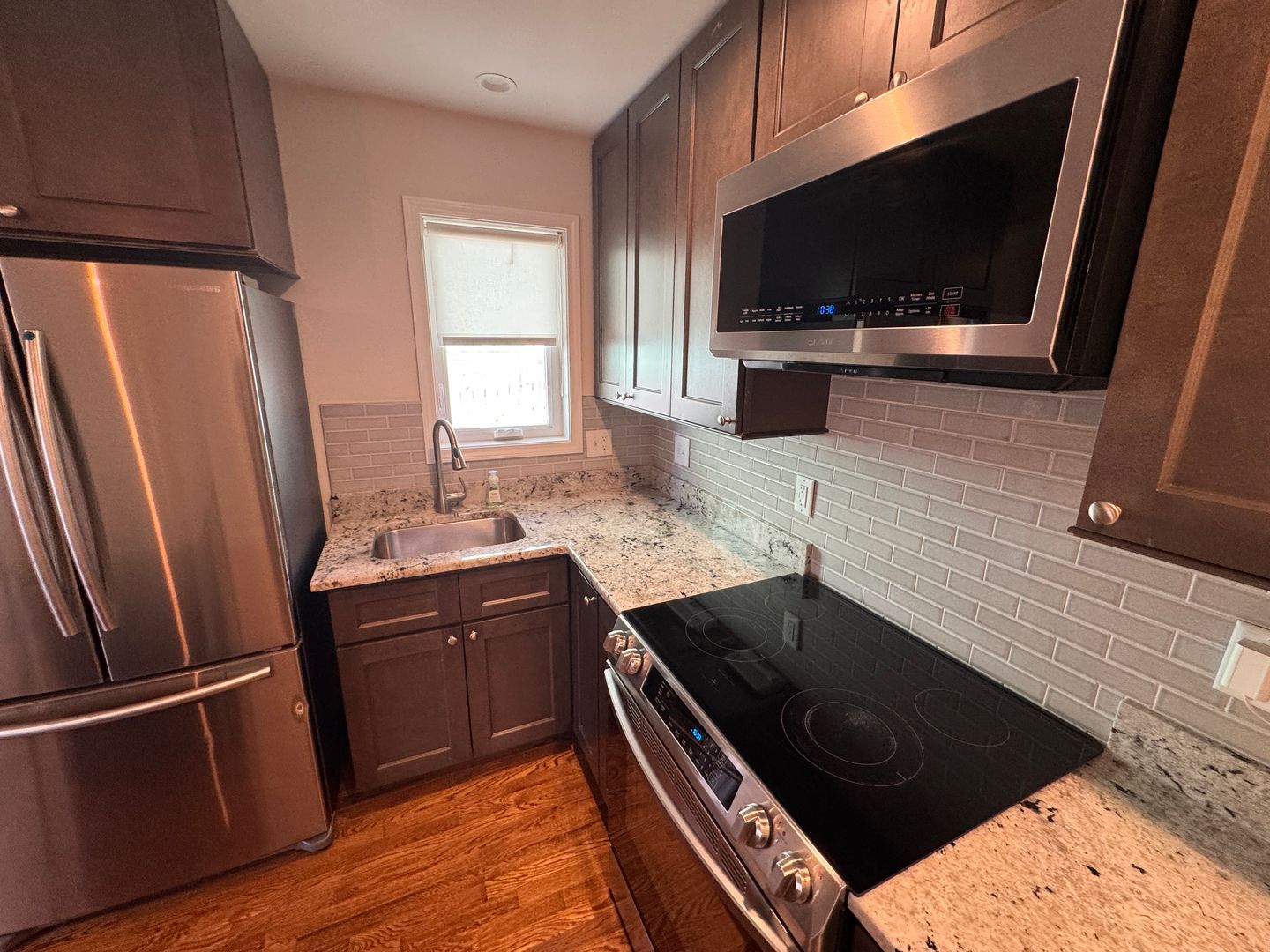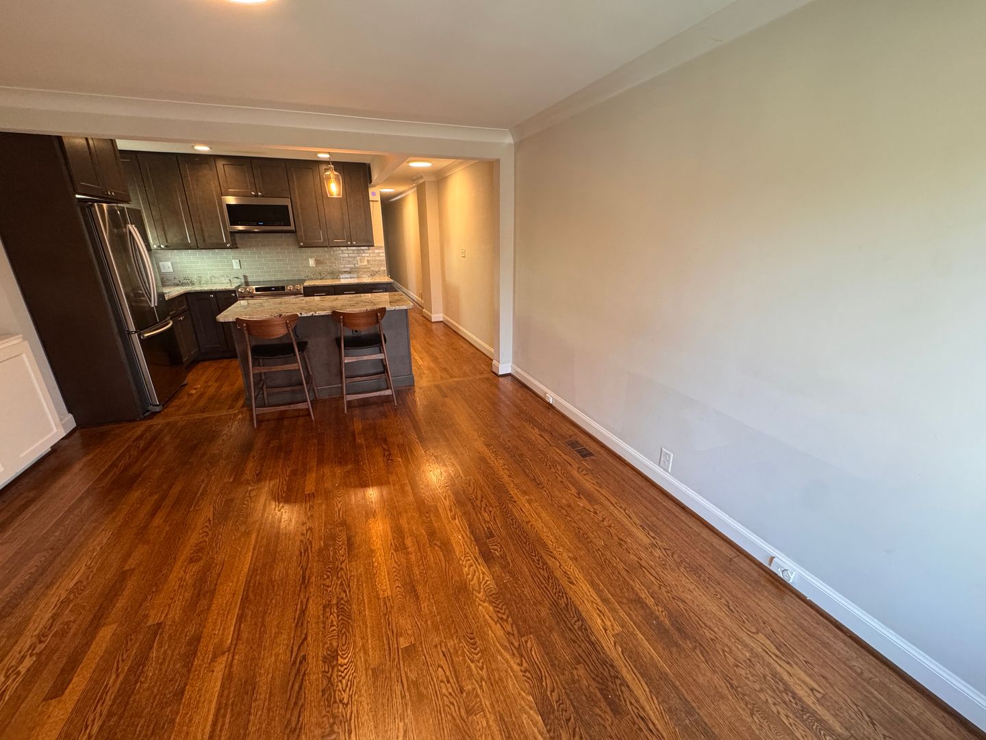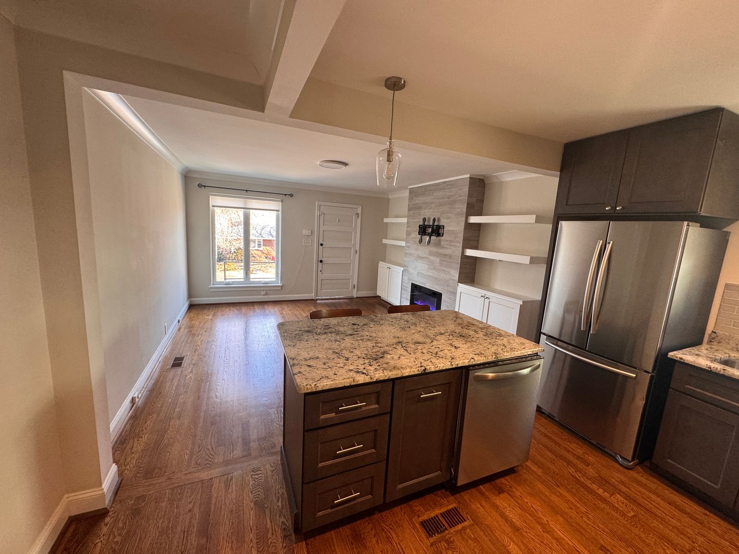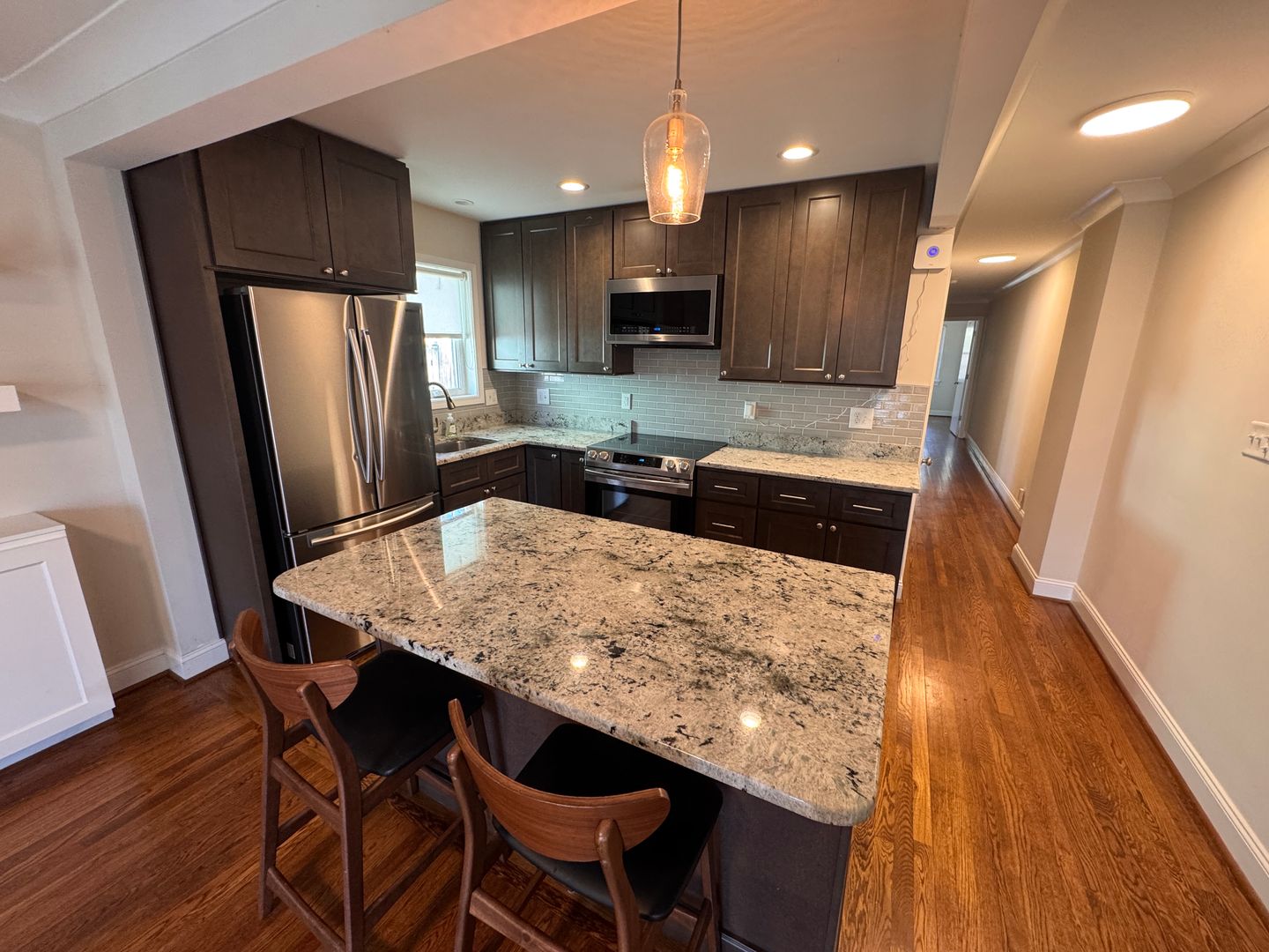 The fully renovated kitchen is a true showstopper, featuring granite countertops, stainless steel appliances, subway tile backsplash, rich espresso cabinetry, and a spacious island perfect for entertaining or casual dining. The open-concept design flows seamlessly into the living area, highlighted by gleaming hardwood floors and abundant natural light.