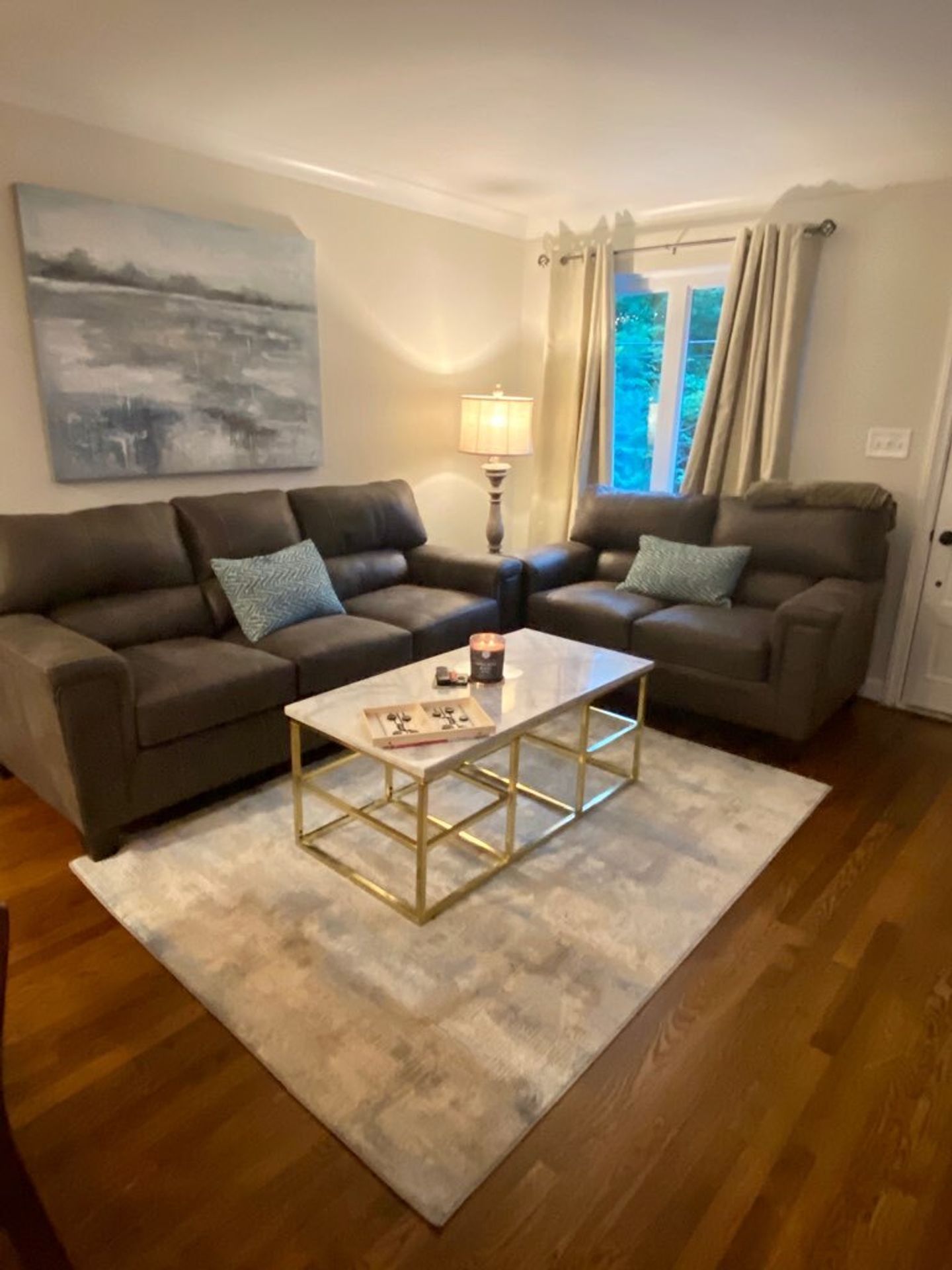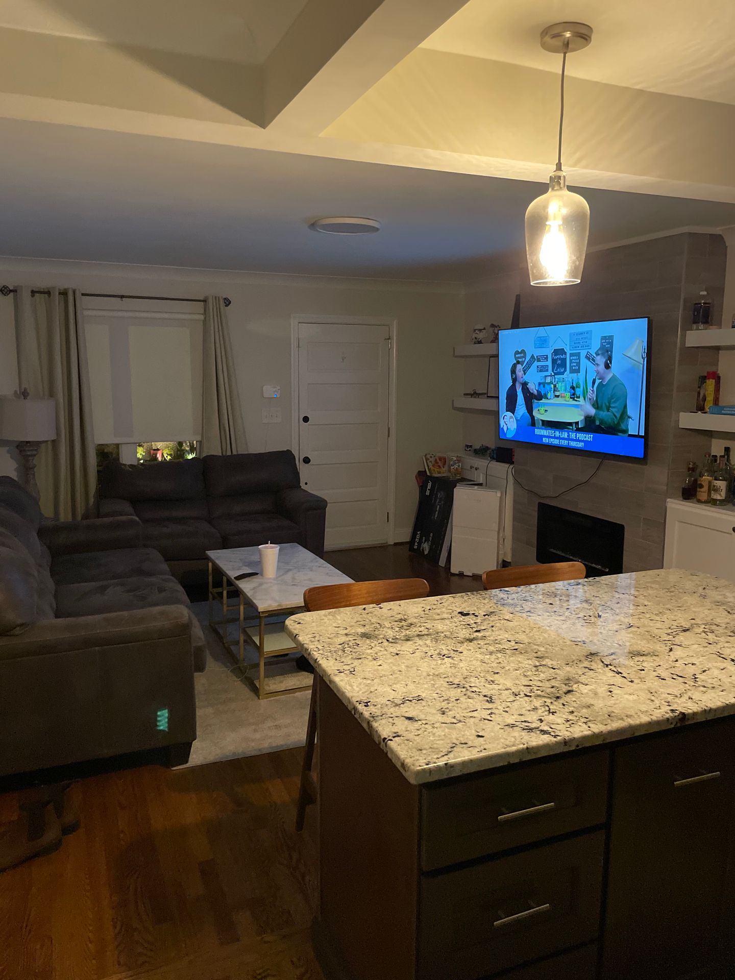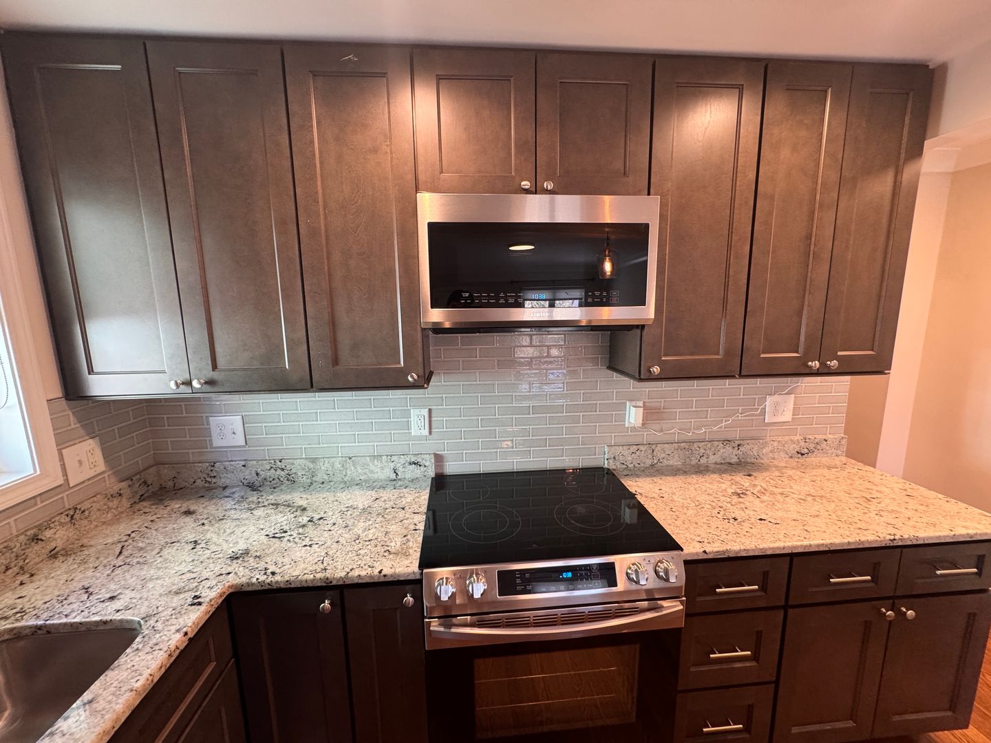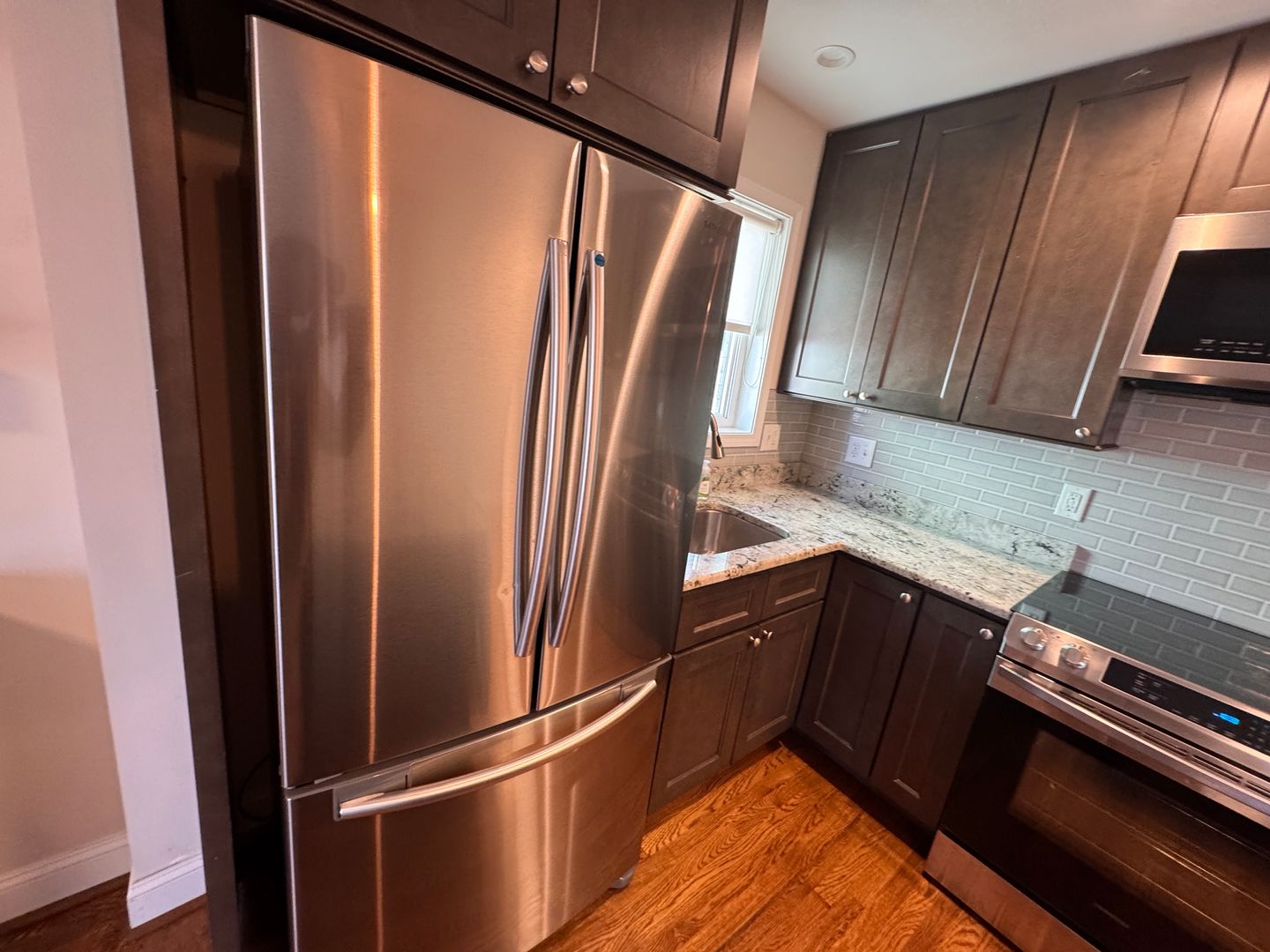 The fully renovated kitchen is a true showstopper, featuring granite countertops, stainless steel appliances, subway tile backsplash, rich espresso cabinetry, and a spacious island perfect for entertaining or casual dining. The open-concept design flows seamlessly into the living area, highlighted by gleaming hardwood floors and abundant natural light.